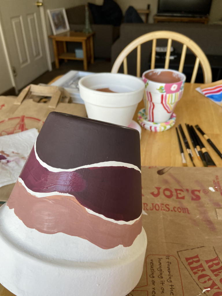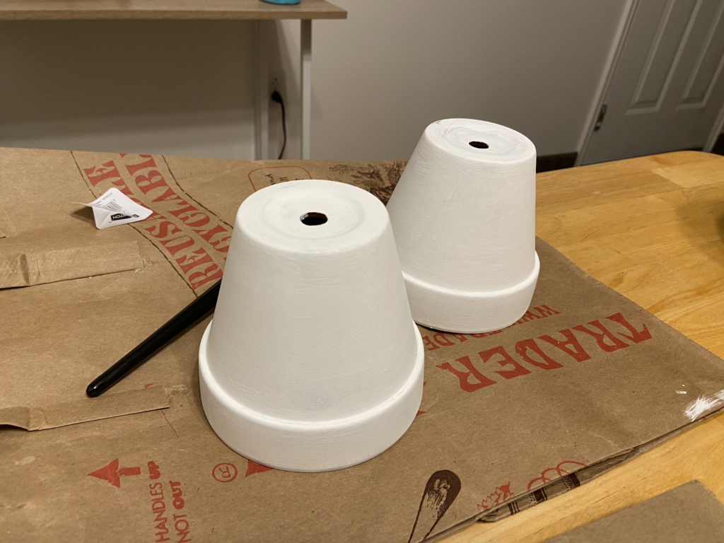 - Time to paint the base coat of the pots! I painted them white so other colors would show up well on top! Make sure the pots are dusted off before painting, especially if they have been used before!