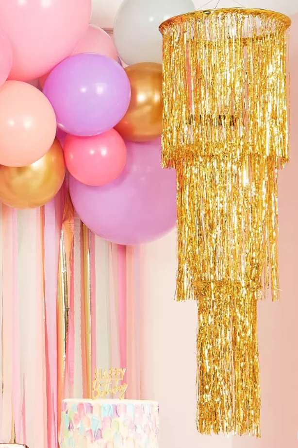 Streamer Chandelier: This streamer chandelier is SO easy to DIY with some hula hoops and sparkly streamers! This is the perfect party decoration for a birthday, new years, or bachelorette party. Or, buy this one from Target!