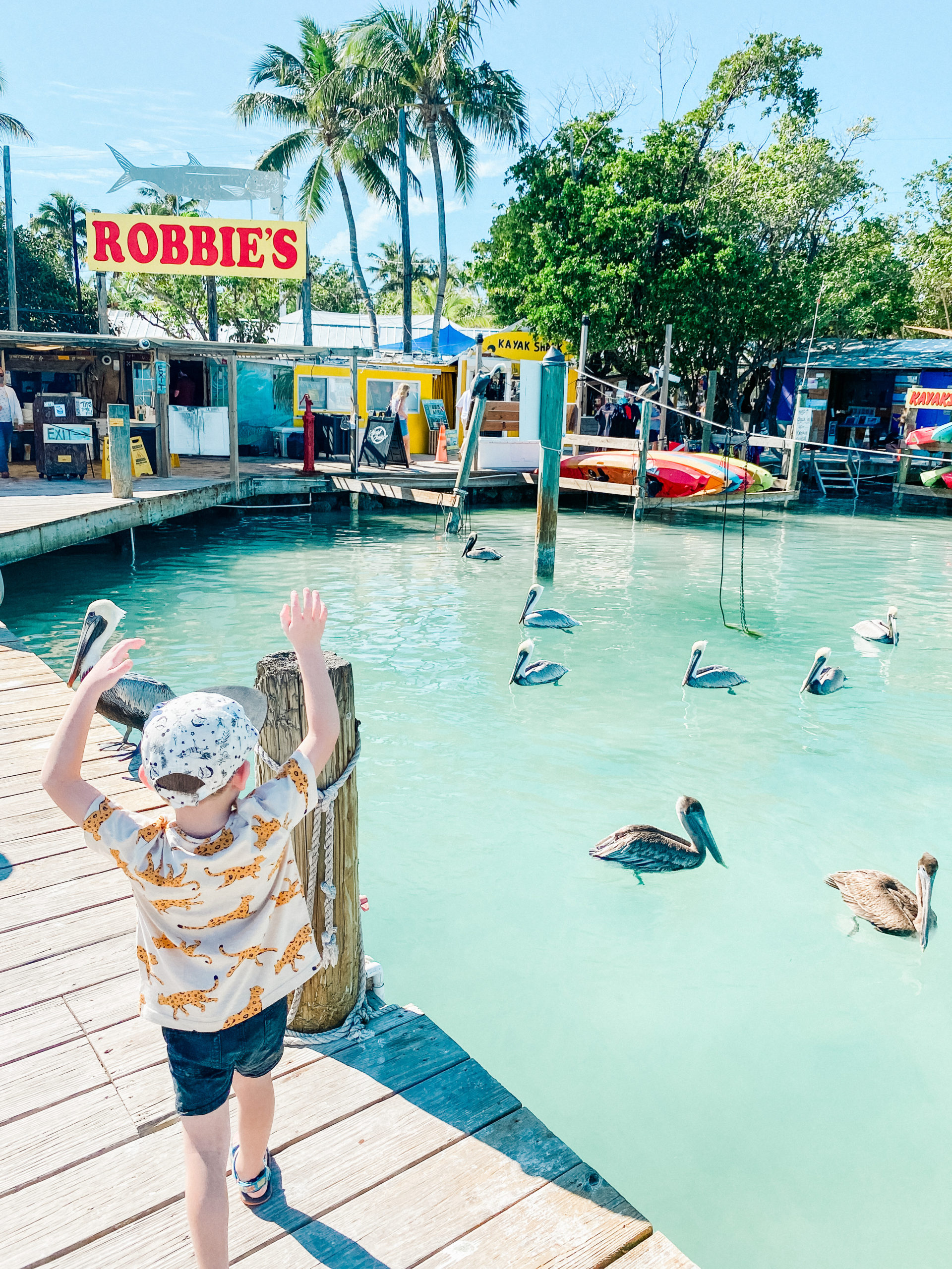 The next main key to really stop at is Islamorada. And you need to stop at Robbie’s! Robbie’s is such a fun unique stop. You can go out on tours and boat excursions here. But you have to stop to feed the giant tarpon fish. You pay to buy buckets of fish to feed to these giant tarpons that circle the area. Some are so big that my son thought they were sharks. It is also really fun to see the giant pelicans that are also trying to sneak your fish.